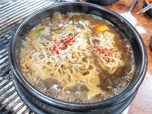 이후 1990년대부터 뼈 없는 닭갈비가 주류로 자리 잡으며 고기만으로 배불리 먹는 식사가 가능해졌고 우동사리는 메뉴에 특별함을 더하는 ‘명품 카메오’로 자리매김하게 됐다. 닭갈비에서 양념이 잔뜩 묻은 우동사리는 젓가락으로 한 입 밀어넣으면 후루룩 넘어가는 식감이 매력적이다. 시간이 지나면 양념과 함께 우동이 철판에 늘어붙기 시작하는데, 고기와 함께 한 가닥 한 가닥 떼어 먹는 면발 역시 별미다.