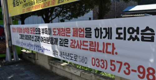 지난달 28일 삼척 도계광업소 본관 인근 게시대. 'OOO닭갈비 삼척점 오픈으로 도계점은 폐업합니다'란 현수막이 걸려 있었다. 1990년부터 도계읍에서 닭갈비집을 운영한 A(63)씨가 내걸었다.