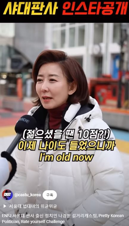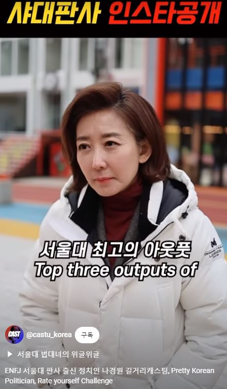 나 전 의원은 23일 한 유튜브 채널에 'ENFJ 서울대 판사 출신 정치인 나경원 길거리 캐스팅'이란 제목으로 올라온 영상에 등장했다.