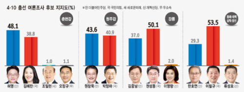 2일 강원일보 등 강원도내 5개 언론사가 여론조사 전문기관인 케이스탯리서치에 의뢰해 지난달 30일부터 4월1일까지 강원 8개 선거구를 대상으로 실시한 여론조사(95%신뢰수준에 ± 4.4%포인트) 결과에 따르면 '이번 총선에서 어느 후보에게 투표하겠느냐'는 질문에 춘천갑에 거주하는 만18세 이상 남녀 500명 가운데 48.1%가 더불어민주당 허영 후보를 선택했다. 국민의힘 김혜란 후보는 38.8%, 새로운미래 조일현 후보 1%, 무소속 오정규 후보 1.1%였다.