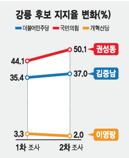 강릉에서는 국민의힘 권성동 후보가 민주당 김중남 후보와의 격차를 두 자릿수로 벌리며 앞서 갔다.