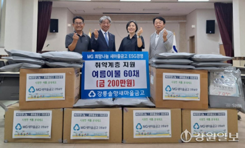 강릉솔향새마을금고(이사장: 심종인)는 지난 1일 여름 무더위를 대비해 교2동(동장: 홍삼녀) 관내 취약계층 가구에 여름이불 60채를 후원했다. 전달된 물품은 기초생활수급자, 독거노인, 복지사각지대 등 소외계층에 전달될 예정이다.