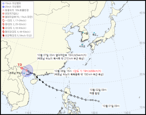 당초 제주도와 일본 남부 큐슈 사이 해안을 관통할 가능성도 배제할 수 없었으나, 7일 밤과 모레 새벽 사이 진로를 급격하게 틀어 태평양으로 향할 것으로 보여 우리나라에는 직접 영향을 끼칠 가능성은 희박하다.