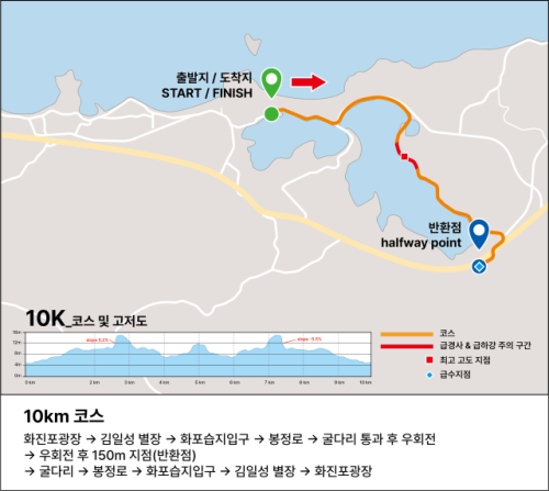 먼저 5㎞ 코스는 화진포 광장을 출발해 호수를 따라 달리다 화진포생태습지 표지판 50m 앞에서 되돌아오는 구간으로, 가족 단위 참가자나 초보 러너에게 안성맞춤이다.