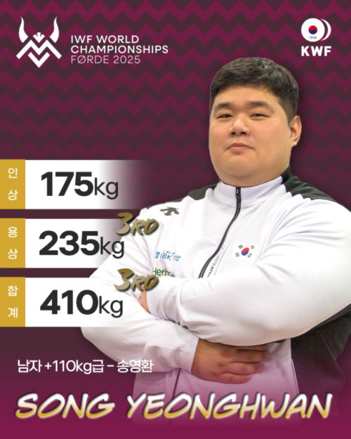 송영환은 지난 12일(한국시간) 노르웨이 푀르데에서 막을 내린 ‘2025 세계역도선수권대회’ 남자 최중량급(+110㎏) 경기에서 용상 235㎏으로 3위, 합계 410㎏으로 3위를 차지했다. 인상에서는 175㎏으로 7위에 머물렀지만 용상에서 특유의 폭발적인 힘을 발휘하며 메달권에 안착했다.
