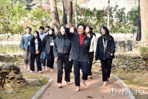 화천군 공직자들의 소통 활성화와 공감대 형성을 위한 ‘한걸음 소통:맨발 톡톡’ 간담회가 화천 붕어섬 황톳길에서 최문순 군수를 비롯한 직원들이 참석한 가운데 열렸다.