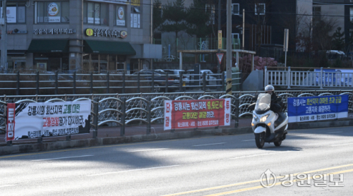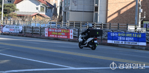 지난 4일 강릉시 회산동 도로변에 인근 아파트 입주민들이 '출퇴근 교통대란 해결'과 '율곡대교 조기 착공'등의 내용의 현수막을 내걸고 있다. 강릉=권태명기자