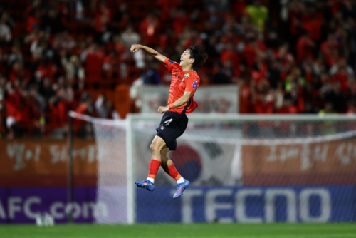 ◇지난 10월22일 비셀 고베와의 ACLE 리그스테이지 홈경기에서 득점을 기록한 후 환호하고 있는 강원FC 송준석. 사진=강원FC 제공