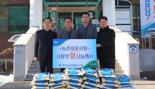홍천군 내면농협(조합장:권영대)은 지난 26일 내면행정복지센터에서 취약계층 돕기를 위한 사랑의 쌀 나눔 행사를 개최했다.