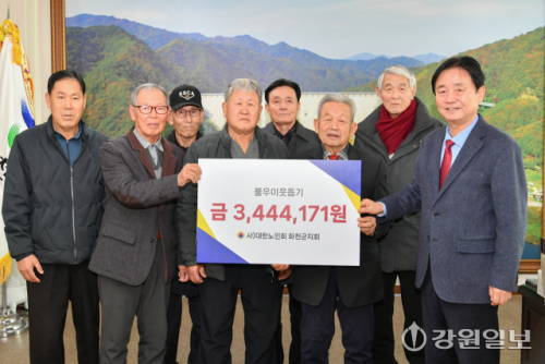 대한노인회 화천군지회(회장:이화원)는 26일 최문순 화천군수를 방문해 이웃돕기 성금 344만4,171원을 기탁했다.