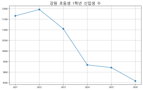 강원도내 초등학교 1학년 신입생이 최근 5년 새 3,000여명 감소한 것으로 나타났다. 저출생 여파로 초등학교 1학년 학령인구 감소가 가속화되는 모양새다. 11일 강원특별자치도교육청에 따르면 올해 도내 초등학교 입학생 대상자는 총 8,582명으로 5년 전인 2022년(1만1,960명)보다 3,378명(28.2%) 감소했다. 도교육청 집계 기준 초등 1학년 취학 대상자는 2023년 1만1,047명으로 1만명대를 유지하다가 2024년 9,341명으로 줄어들었다. 2025년에는 9,215명으로 전년보다 126명(1.3%) 줄었지만, 올해는 8,582명으로 633명(6.8%)이나 감소해 감소폭이 더 커졌다.