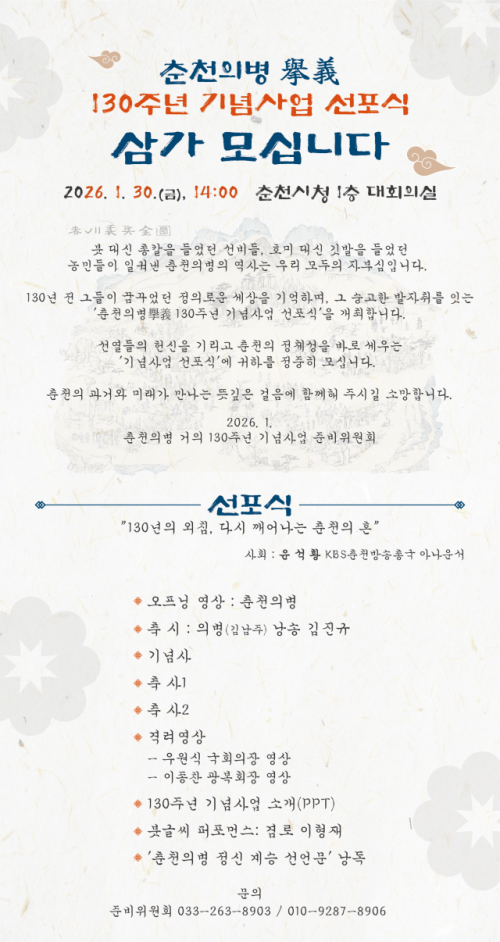 춘천의병 130주년 기념사업회는 30일 오후 2시 춘천시청 1층 대회의실에서 “130년의 외침, 다시 깨어나는 춘천의 혼”을 주제로 춘천 의병擧義 130주년 기념사업 선포식을 개최한다. 축시, 기념사, 축사, 격려영상, 130주년 기념사업 소개, 붓글씨 퍼포먼스, 춘천의병 정신 계승 선언문 낭독 등이 진행될 예정이다.