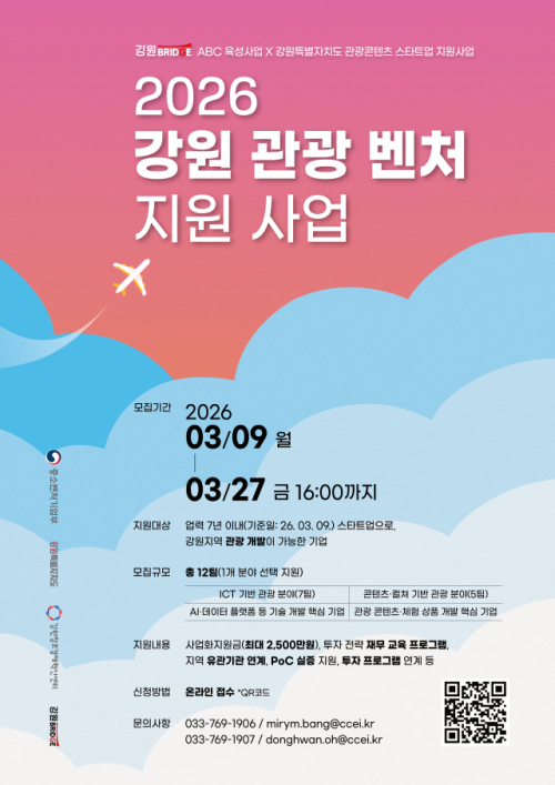 강원창조경제혁신센터(대표이사:이해정, 이하 강원혁신센터)는 오는 27일까지 ‘2026 강원 관광 벤처 지원사업’에 참여할 관광 스타트업 12개사를 모집한다.