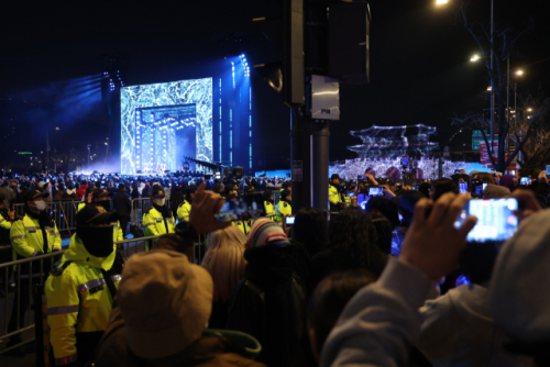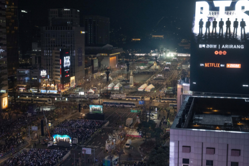 광화문 일대는 BTS의 상징색인 보랏빛 응원봉으로 물들었다. 광장 전체가 거대한 공연장처럼 변한 가운데, 무대와 거리가 있는 시민들도 건물 곳곳의 대형 전광판이나 스마트폰으로 공연 실황을 지켜보며 함께 열기를 나눴다.