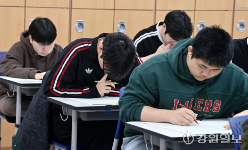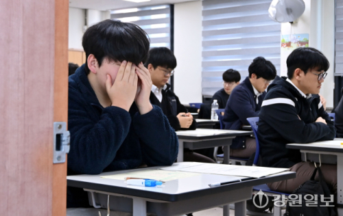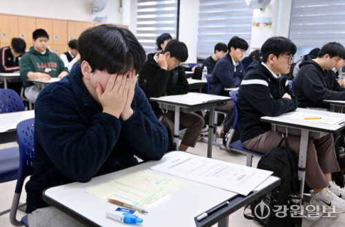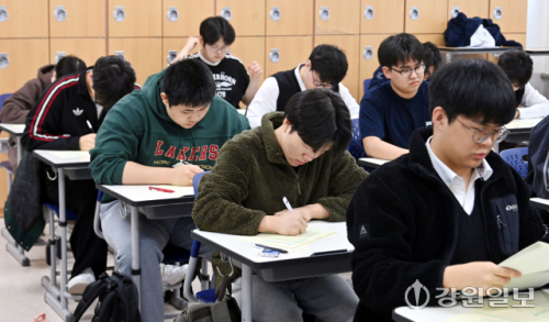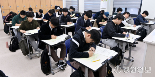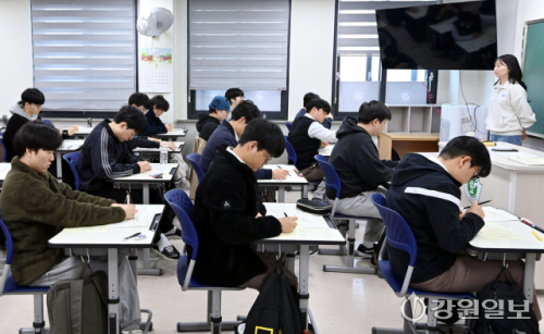 2027학년도 대학수학능력시험 대비 올해 첫 3월 전국연합학력평가(모의고사)가 치러진 24일 춘천고에서 3학년 학생들이 1교시 국어 영역을 준비하고 있다. 임도혁기자
