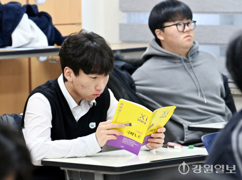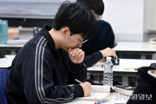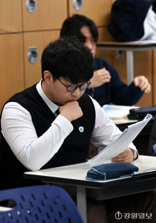 2027학년도 대학수학능력시험 대비 올해 첫 3월 전국연합학력평가(모의고사)가 치러진 24일 춘천고에서 3학년 학생들이 1교시 국어 영역을 준비하고 있다. 임도혁기자