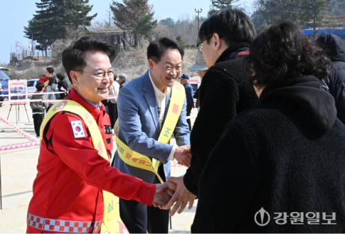 육동한 춘천시장(왼쪽)과 허영 국회의원이 28일 춘천시 삼천동 수변공원에서 열린 2026 희망의 나무 나눠주기 행사에서 시민들과 인사하고 있다. 신세희기자