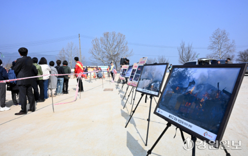28일 춘천시 삼천동 수변공원에서 열린 2026 희망의 나무 나눠주기 행사에서 산불 경각심을 일깨우기 위해 과거에 발생한 도내 대형 산불 피해 사진이 전시되어 있다. 신세희기자
