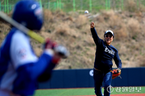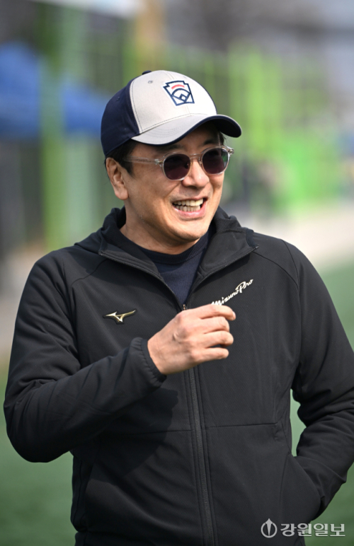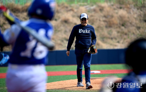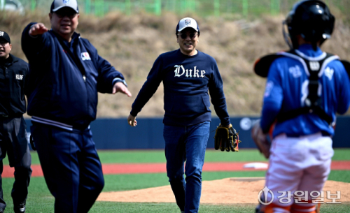 영화배우 출신 김승우 한국리틀야구연맹회장이 3일 춘천에서 열린 강원일보 주최 춘천시장기 리틀야구대회를 찾아 개막 시구를 하는 등 참가 선수들과 지도자 경기운영진들을 격려했다.