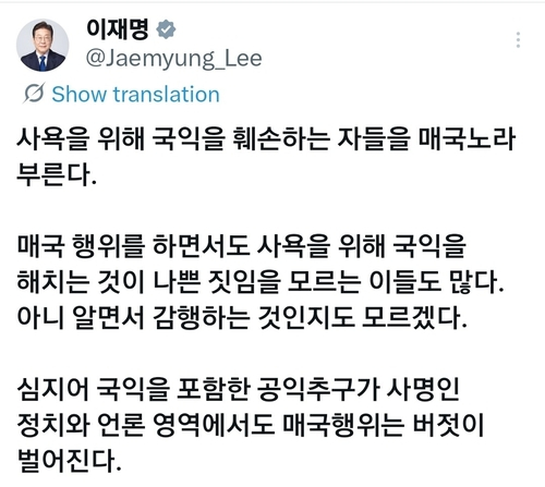 이 대통령은 이어 “사욕 때문에 국익을 해치는 자들을 매국노라고 부른다”며 “매국 행위를 하면서도 그것이 잘못인지조차 모르는 이들이 많고, 알면서도 저지르는지도 모르겠다”고 지적했다. 또 “국익을 포함한 공익 추구가 사명인 정치와 언론 영역에서도 매국 행위가 버젓이 벌어진다”며 “이 역시 우리가 힘을 모아 바로잡고 극복해야 할 국가적 과제이자 ‘비정상의 정상화’ 과제”라고 강조했다.