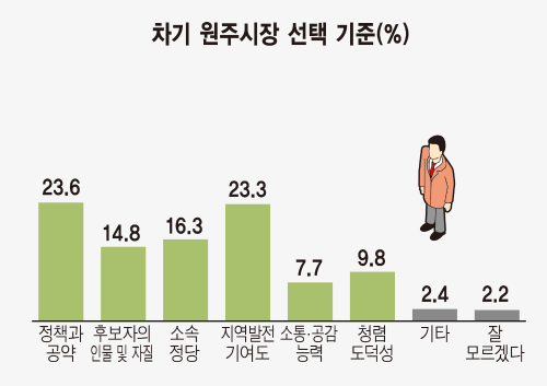 원주시민들이 차기 시장 선택을 위해 가장 중요하게 삼는 기준은 ‘정책과 공약’(23.6%)이었다. 원강수 후보는 주로 ‘지역 발전 기여도’, ‘청렴 도덕성’을 중요하게 생각하는 응답자로부터 선택을 받으면서 현역 프리미엄을 앞세워 반전을 노리고 있다. ‘정책과 공약’, ‘후보자의 인물 및 자질’, ‘소속 정당’, ‘소통·공감 능력’을 중요하게 생각하는 응답자의 과반은 구자열 후보를 택했다.