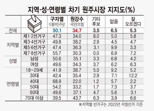 ■4년만에 바뀐 표심⋯구자열 40~60대서 앞서= 구자열 후보(50.1%)와 원강수 후보(34.7%)의 지지도 차이는 15.4%포인트다. 4년 전 지선에서 원 후보가 53.6%, 구 후보가 46.4%를 얻었던 것에 비하면 여론의 흐름이 완전히 뒤바뀐 것이다.