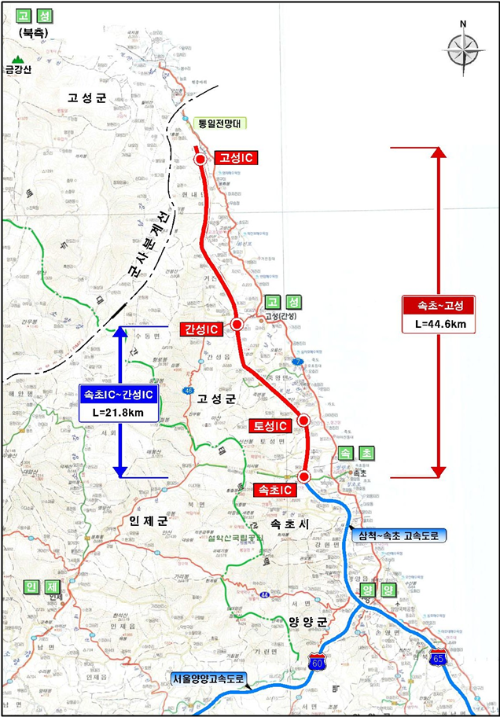 속초~고성고속도로는 길이 44.6㎞(사업비 2조 5,377억원)으로 지난해 말 정부의 재정평가위원회에서 예타 대상으로 선정되지 못했다.