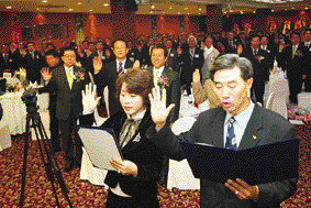 ◇이번 신년인사회에는 강원도 최대 숙원사업인 평창동계올림픽 유치와 17대 대통령선거 등이 열리는 해인 탓인지 과거에 비해 도출신 각급 기관단체장 등 출향인사들이 대거 참석. 1,000여명에 달하는 출향 인사들이 한꺼번에 몰리면서 행사장내에는 당초 준비한 좌석이 모자라 뒤늦게 도착한 인사들은 장내 주변에 서서 행사를 참관. 평창동계올림픽 사인벨트 서명 행사때는 김진선지사와 윤세영회장이 먼저 서명을 한 이후 참석자들이 줄지어 서명에 동참해 인산인해의 장관을 연출.