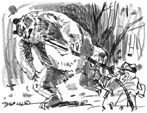 “잘한다. 잘해.” 윤 포수가 그쪽으로 달려가면서 새들을 격려했다. 아버지의 원수를 갚겠다고 윤 포수를 따라간 철호 포수는 그런 윤 포수를 보고 크게 놀랐다. 사랑방에 점잖게 앉아 있던 그 양반 어른이 그렇게 빠르게 뛸 줄 몰랐다. 마흔 살이 넘은 나이였는데도 그는 표범처럼 민첩했으며 도저히 따라갈 수가 없었다. 곰은 피를 흘리고 있었다. 깊은 상처는 아니었지만 개들에게 물려 털이 뽑히고 껍질이 찢겨 피투성이가 되어 있었다. 현장에 도착한 윤 포수는 냉철했다. 윤 포수가 총을 들어 올려 곰을 겨냥하자 개들이 얼른 좌우로 물러났다. 곰과 맞붙어 싸움을 하고 있으면 사냥꾼의 사격에 방해가 되었으므로 개들은 그렇게 물러나 사냥꾼에게 총을 쏠 기회를 주었다. 그건 사냥꾼과 개들 사이에 맺어지고 있는 약속이었다. 윤 포수는 10m쯤의 거리를 두고 곰과 대치했다. 개들은 빠지고 곰과 사람이 맞대결을 했다. “이놈, 불 받아라.” 윤 포수가 버럭 소리를 질렀고 그 소리에 놀란 곰이 반사적으로 벌떡 두 다리로 일어섰다. 윤 포수는 총을 들어 올렸다. 그의 총은 예사 총이 아니었다. 그 당시 포수들은 산탄총을 쓰고 있었으며 사정거리가 길고 파괴력이 훨씬 강한 라이플은 조선인들뿐만 아니라 일본인 포수들도 소지를 할 수 없었다. 요인(要人) 암살용으로 쓰일 위험이 있었기 때문이었다.