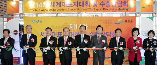 제14차 월드 옥타(OKTA) 세계대표자 대회 및 수출상담회가 27일 평창 알펜시아리조트 컨벤션센터에서 열려 최문순지사와 권병하 옥타회장 등 참석인사들이 테이프를 자르고 있다.