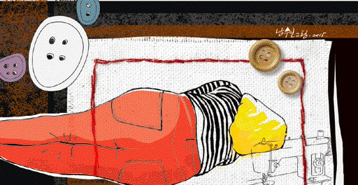 어두운 집. 불도 켜지 않고 그녀는 침대로 가 남자의 옷을 벗기고 자신의 옷도 모두 벗어 버렸다. 남자를 뉘고 나서 그녀는 침대 협탁 서랍에서 새로 사 둔 골무를 꺼내 손에 끼운다. 쇠로 된 골무는 메탈 음악을 좋아하는 젊은이들의 반지처럼도 보인다. 그것은 밋밋하지 않다. 바늘귀 크기의 작은 골이 딸기 씨 박히듯 촘촘히 파여 있다. 그녀는 골무를 양쪽 손가락 열 개에 모두 끼우고. 남자를 애무한다. 강하게 남자의 피부를 자극한다. 남자는 조금 놀란다. 하지만 그녀가 남자의 손을 자신의 젖가슴에 대어주자 남자는 가슴의 부피와 촉감에 빠져 곧 그녀의 손길에 서서히 자신의 몸을 맡긴다. 그녀가 쇠로 무장된 손으로 남자의 성기를 잡고 오럴 섹스를 시작한다. 남자의 두 손이 자신의 머리카락을 쥐었다. 그녀의 머리카락을 쥐었다. 이불을 움켜쥐었다. 자리를 찾지 못하고 사방을 헤맨다. 그녀는 조금씩 더 강도를 높여 남자의 몸 곳곳에 골무의 무늬가 찍히도록 누르고 찍고 긁는다. 피부는 고통을 감지하는 센서다. 그러나 신중하게 피부를 다루면. 설사 바늘이 뚫고 들어온대도 고통스럽지 않다는 것을. 그녀는 이미 손바닥 바느질을 통해 알고 있었다. 그녀는 고통스럽지 않은 상처로 남자를 이전과는 다른 즐거운 곳으로 이끈다. 어찌할 줄을 모르고 버둥거리는 남자의 몸 위로 단추가 올라탄다. 남자가 헉. 소리를 삼킨다. 그녀는 지금부터 시작이라는 듯 검지를 입에 대고 쉿~. 그녀의 풍만한 엉덩이가 리드미컬하게 움직이자 남자는 사경을 헤매듯 눈빛을 게게 푼다. 그녀는 남자의 몸을 타고 앉아 템포 조절을 한다. 남자는 아무런 저항도 하지 못한다. 그는 자신이 할 수 있는 일을 하나도 찾을 수 없다. 그녀의 이 움직임이 멈추지 않기를. 그리고 어서 멈추기를. 바랄 수 있을 뿐이다. 그녀는 남자의 몸을 바늘 삼아 자신의 단추 구멍에 통과시키는 행위를 정성스레 반복한다. 두 몸이 그렇게 하여 고정될 수 있을 것처럼. 남자가 결국 비명을 지르며 일어났다. 그녀는 일어나 앉은 남자의 어깨를 잡고 속도를 높인다. 몇 초 뒤. 남자의 몸에 있던 모든 기운이 빠지고. 남자는 쓰러져 버렸다. 그녀는 쓰러진 남자의 몸에 마지막으로 콕콕콕. 쇠로 된 골무의 무늬를 찍는다.