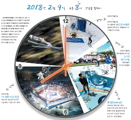 2018평창동계올림픽 시계가 빨라지고 있다. 미리 보는 동계올림픽인 테스트이벤트가 다음 달부터 내년 4월까지 5개월여간의 대장정에 돌입한다. 이 기간 동계올림픽 17개 종목과 패럴림픽 5개 종목 등 총 22개 대회를 개최한다. 경기장 등 시설준비도 마무리 공사가 한창 진행 중이다. 올림픽 기간 전 세계에 선보일 우리나라의 우수한 문화콘텐츠 육성 작업 역시 속도를 내고 있다.