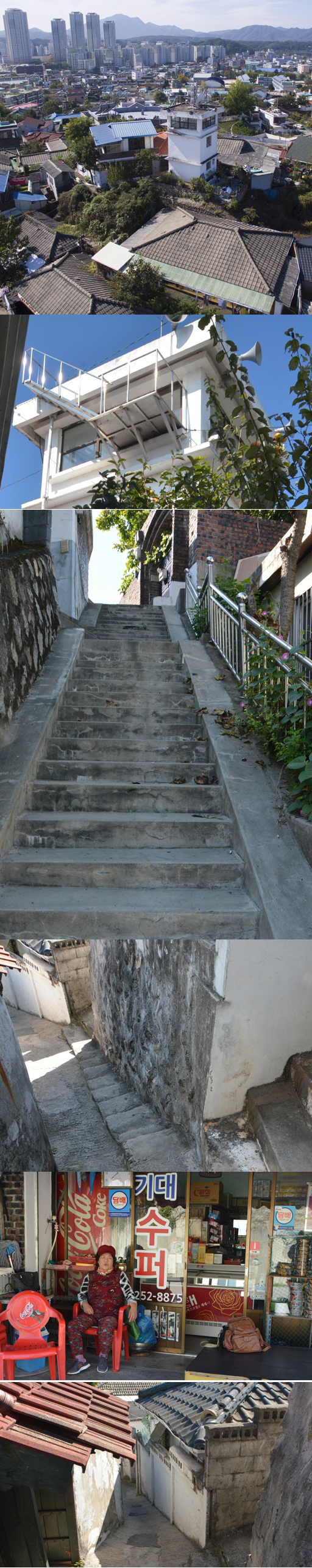 써 27년째 슈퍼를 운영하고 있다는 정성여(74)씨는 망대골목의 '문화해설사'라 불러도 손색이 없을 정도다. “아이고, 제주도에서도 와. 난 아주 길 안내자 하느라고 고생이야. 생기는 것도 없이 이리저리 왔다 갔다 하면서(웃음)… 망대가는 골목길은 간단해. 계단으로 된 첫 골목을 올라가면 대문이 보이거든. 그게 막힌 게 아니니까 차렷하고 우회전하면 바로 망대로 가는 골목이야 그게.” 아주머니의 말대로 기대슈퍼에서 몇 발자국 아래로 내려가니 왼편으로 좁은 계단으로 된 오르막 골목길이 보인다. 골목 정상에 녹색대문집이 바로 보이는데 거기서 오른편으로 돌면 망대 바로 아래까지 다다를 수 있다. 그곳에서 보는 춘천 풍경은 그야말로 일품이다.