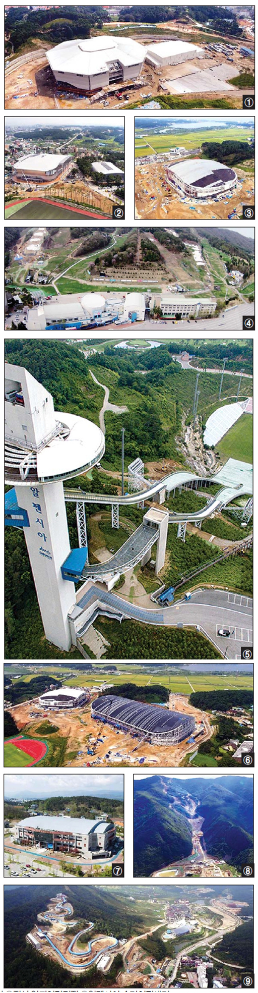 ■올 연말까지 7개 경기장 100% 완공=2018평창동계올림픽 경기장은 총 12곳(장소 기준, 보조경기장 제외)이다. 이 중 7개 경기장이 올 연말이면 100%의 공정률을 기록하게 된다. 올 연말 완공되는 경기장은 강릉 아이스아레나, 강릉 하키센터, 관동 하키센터, 깅릉 컬링센터, 알펜시아 스키점프센터, 알펜시아 크로스컨트리센터, 알펜시아 바이애슬론센터 등 7곳이다. 정선 알파인경기장은 85%, 용평 알파인경기장은 72%, 보광 스노경기장은 85%, 알펜시아 슬라이딩센터는 95%, 강릉 스피드스케이팅경기장은 85%가 올 연말까지의 목표 공정률이다. 이들 5개 경기장도 현재 부대시설 공사가 진행 중이다. 따라서 앞으로 있을 테스트이벤트에는 지장이 없다.