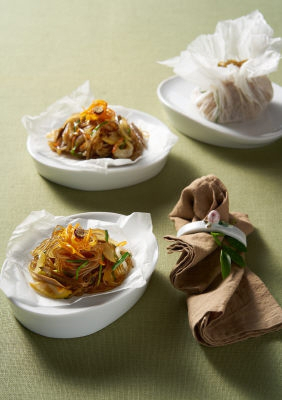 4. 준비해 놓은 채소와 당면을 버무린 뒤 1인분씩 나누어 유산지에 넣어 싼 뒤 냉장 보관한다.