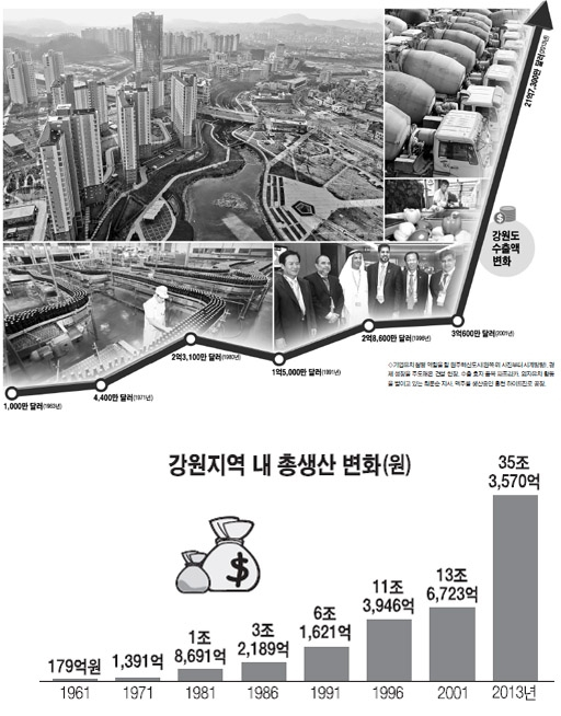 이어 잠시 하락세를 보이던 강원수출은 2013년 기준 21억7,300만달러를 거뒀다. 50년 만에 강원수출은 수치상으로 218배 증가했다.