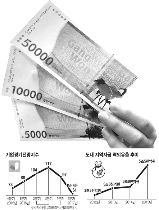 특히 강원경제는 지역에서 생산되는 재화가 실시간으로 수도권으로 유출되고 있다. 돈은 강원도에서 벌고 소비는 서울이나 경기도에서 하고 있다. 2015년 기준 강원도 지역자금 유출 규모는 5조5,000억원이다. 전년 대비 1조6,000억원이나 늘어난 규모다. 지역자금의 역외유출 경로는 대부분 외지 건설사, 은행, 대형 유통업체, 기업형 SSM, 온라인 쇼핑 등이다.