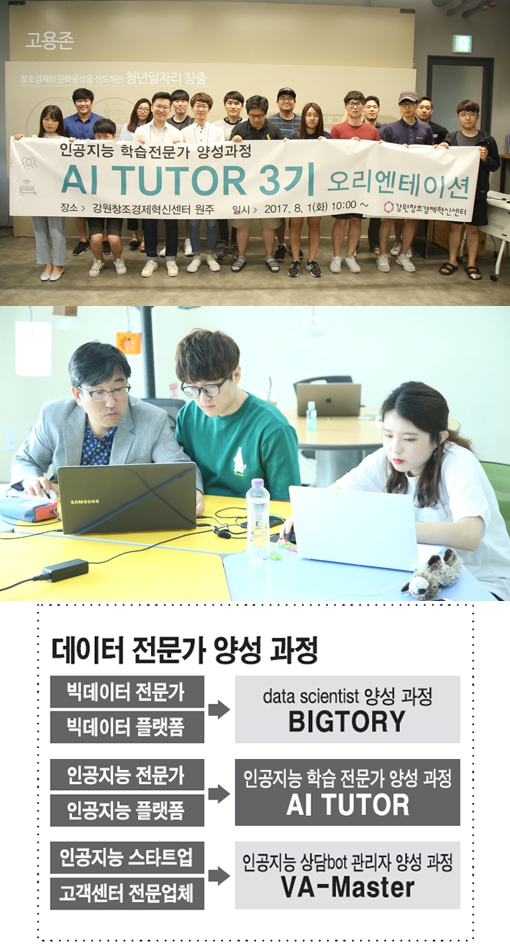 빅데이터에 대한 이론, 실습교육을 하며 소양을 키운 후에는 산업화 적용이 가능한 인공지능 학습 전문가 양성 과정인 'AI 튜터'로 넘어간다. 최종적인 응용 단계는 '인공지능 상담봇' 양성 과정인 'VA 마스터'다.
