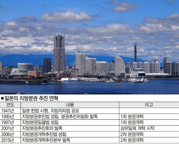 ■20년 전 시작된 지방분권 움직임=1947년 일본은 지방자치법이 공포되고 신헌법이 제정되면서 현대적 형태의 지방자치 제도를 갖추게 됐다. 이후 신헌법을 토대로 1995년 지방분권추진법이 시행되면서 1차 지방분권개혁이 시작된다. 지방분권추진법은 지방자치단체가 지역의 행정을 자주적이고 종합적으로 담당한다고 명시했다. 국방 같이 전국적으로 처리해야 할 일을 제외하곤 지역의 일은 지역에서 주체적으로 처리한다는 것을 선언한 것이다. 이어 2001년 국가보조금 개편을 통한 세제 개혁인 일명 '삼위일체' 개혁이 시작됐다. 2006년엔 지방분권추진법 개정이 이뤄지며 2차 지방분권 개혁 시기에 접어들었다. 법의 개정뿐만 아니라 내각총리대신이 중심이 된 분권추진본부 등이 세워지며 1차 개혁에서 미진한 부분을 보완했다.