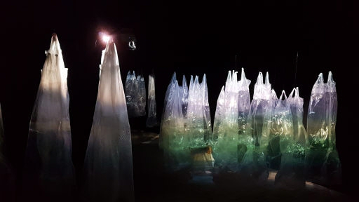 비닐봉지의 표면은 때로 스크린이 되기도 하는데, 투영된 비디오 영상이 바람의 영향을 받아 움직이는 봉지의 표면 변화에 따라 함께 움직인다. 유동하는 반투명 표면에 투사된 비디오 영상은 고유의 리얼리티를 띠며 완전히 다른 종류의 공간을 만들어 낸다.