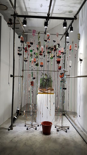 식물 정원을 둘러싼 불긋한 액체는 식물들이 벌이는 영역 다툼의 처절함을 상징한다. 녹색과 붉은 수액 팩은 이들의 전투에 영향을 미치거나 끼칠 수많은 내·외부적 조건과 그로 인해 파생되고 앞으로 중요한 요인으로 작용할 수도 있는 결과물들을 의미한다.