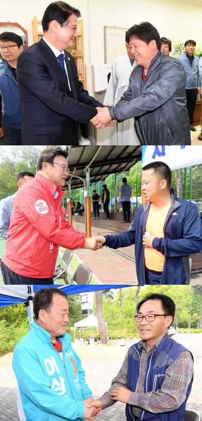 각 정당마다 6·13 지방선거 원주시장 후보가 확정되며 선거 열기가 달아오르고 있다. 1일 원창묵(더불어민주당·왼쪽) 원주시장, 원경묵(자유한국당·가운데) 원주시장 예비후보, 이상현(바른미래당·오른쪽) 원주시장 예비후보 등이 시민들에게 인사하고 있다.