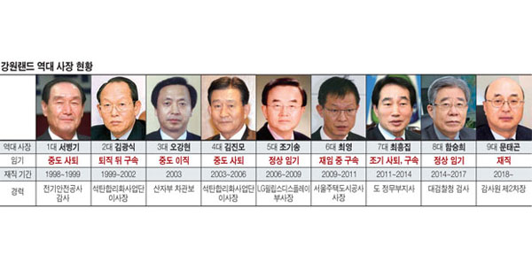 1998년 강원랜드 설립부터 현재까지 20년간 성과는 둘째치고 3년의 임기를 채운 사장을 찾아보기 힘들다. 제1대 사장인 서병기, 2대 김광식, 3대 오강현, 4대 김진모, 5대 조기송, 6대 최영, 7대 최흥집, 8대 함승희 사장까지 8명의 CEO 중 정상적으로 임기를 마친 경우는 3명에 불과하다.