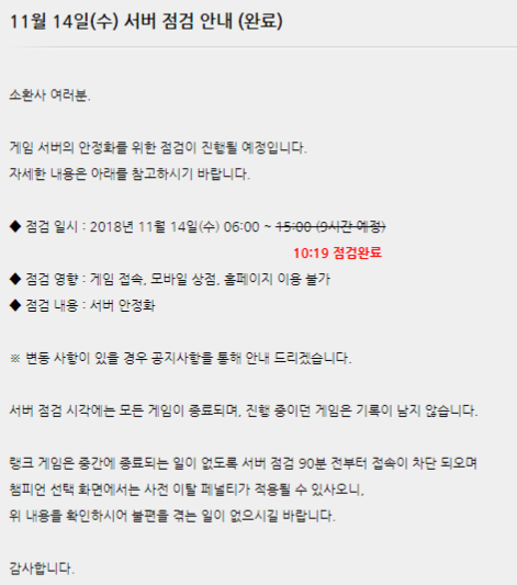 14일 리그오브레전드(이하 '롤') 홈페이지에는 서버 점검 안내(완료) 공지사항을 올렸다.