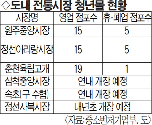 청년몰 조성사업은 전통시장의 유휴공간을 활용해 시설 개선비로 시장에 최대 15억원을 지원하는 사업이다. 최근 4년간 도내에 59억원이 지원됐다. 원주중앙시장은 올해 초 발생한 화재로 휴·폐업 점포가 지난해 1개에서 올해 5개로 크게 늘었다. 육림고개는 휴업 점포가 1개 있었다. 정선아리랑시장은 월 임대료 3만원이란 파격조건에도 불구하고 점포 5곳이 6개월째 주인을 못 찾고 있다. 연내 개장을 준비 중인 삼척중앙시장도 모집 인원 25명 중 20명만 모인 상태다.