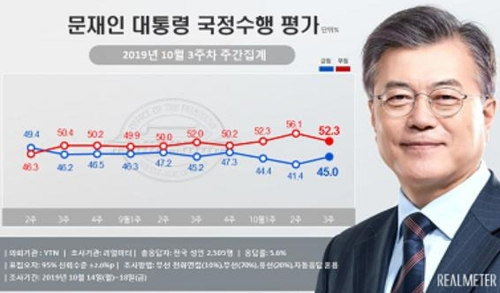 여론조사전문기관인 리얼미터가 ytn의 의뢰로 지난 14~18일까지 5일간 전국 19세 이상 유권자 2,505명을 대상으로 실시한 대통령 국정수행 지지율 및 정당지지도 여론조사(표본오차 95% 신뢰수준에 ±2.0%포인트)결과 10월3주차 문 대통령의 지지율은 전주보다 3.6%포인트 오른 45.0%(매우잘함 28.9%, 잘하는 편 16.1%)를 기록했다.