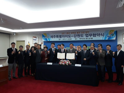 도는 22일 제주도청 삼다홀에서 김성호 행정부지사와 김성언 제주 정무부지사가 참석한 가운데 강원과 제주의 상생 발전을 위한 업무협약을 체결하고 양 지방자치단체 간 지역경제 활성화 및 한반도 평화 분위기 조성을 위한 교류협력을 확대하기로 했다.