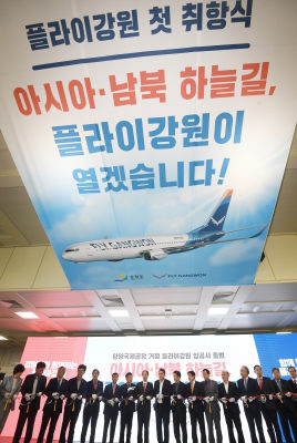 플라이강원 취항식이 이날 오후 양양국제공항 2층에서 이양수 국회의원과 최문순 지사, 한금석 도의장, 김양호 삼척시장, 김철수 속초시장, 김진하 양양군수, 고제철 양양군의장, 주원석 플라이강원 대표, 기관·단체장, 주민 등 300여명이 참석한 가운데 열렸다.
