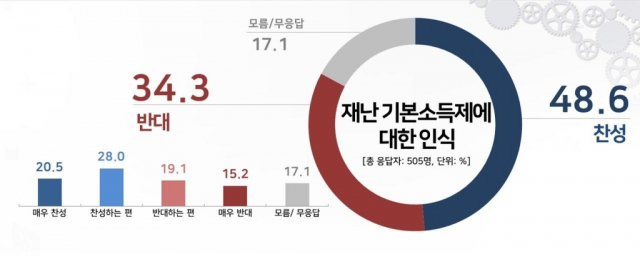 코로나19로 인한 재난상황에서 국민에게 동등하게 일정 금액을 지급하는 ‘재난 기본소득제’도입에 대해 응답자 절반 가까이 ‘찬성’하는 것으로 나타났다.