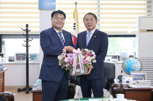 심규언 동해시장은 25일 화훼농가를 돕기 위한 '플라워 버킷 챌린지'에 동참, 최석찬 동해시의장에게 꽃바구니를 전달했다.